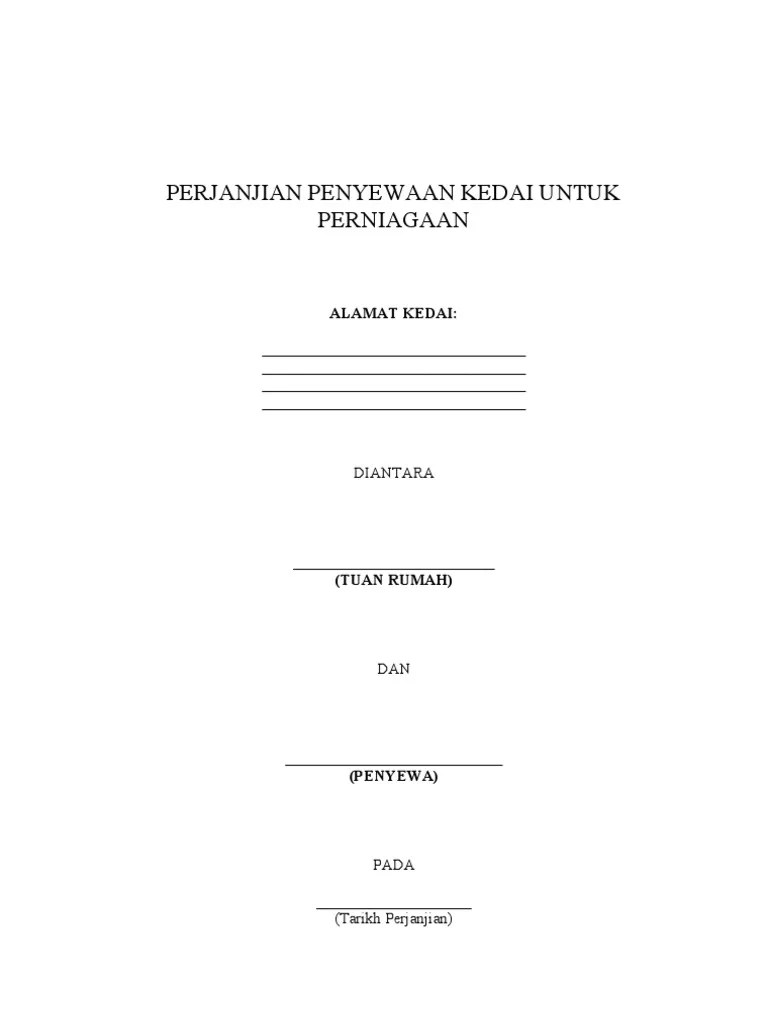 Memiliki sebuah surat perjanjian sewa kedai yang ringkas & . Info mengenai perjanjian sewa kedai. Contoh dokumen atau surat perjanjian kontrak sewa bangunan, rumah, kedai dan gudang. Perjanjian diperbuat pada (tarikh) di antara (nama tuan rumah) di alamat . "penyewa juga dinasihatkan untuk menurunkan tandatangan ringkas di setiap helaian muka surat perjanjian bagi menunjukkan mereka telah membaca .